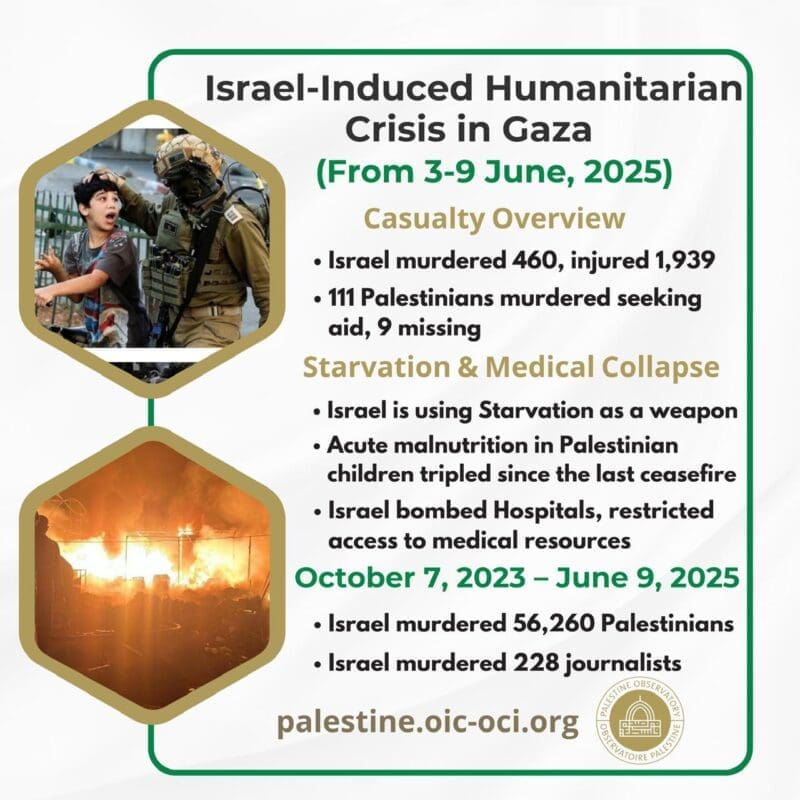Israel Plans to Seize Area C of the West Bank, and a Demolition Warning Issued for 100 Homes in Jenin Photo from the Palestinian News and Information Agency (PNA) June 10, 2025 The Organization of Islamic Cooperation’s Media Observatory on Israeli Crimes against Palestinians recorded the deaths of 460 murdered Palestinians and 1939 injured in […]