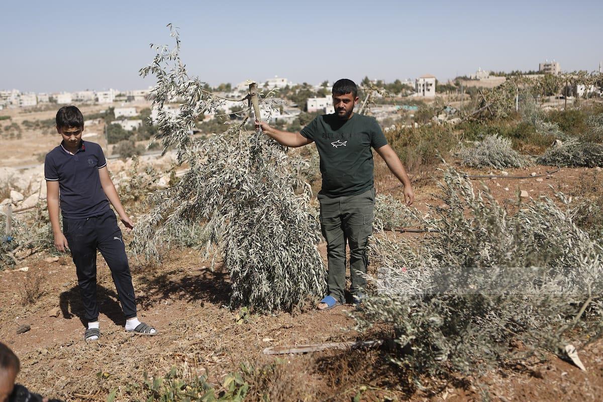 Palestinians display the damage inflicted by the Israeli occupation on olive trees in the village of Al-Maniya, near Bethlehem. (WAFA News Agency).