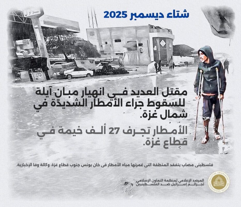 الفلسطينيون في غزة يموتون بردا وتحت أنقاض مبانٍ متصدعة وبنيران الاحتلال المباني التي قررت سلطات الاحتلال هدمها في مخيم نور شمس بطولكرم. وكالة وفا الإخبارية رام الله، 16 ديسمبر 2025 سجّل المرصد الإعلامي لمنظمة التعاون الإسلامي لجرائم إسرائيل ضد الفلسطينيين، 78 اعتداء للمستوطنين على البلدات والقرى الفلسطينية خلال الفترة بين 9 إلى 15 ديسمبر 2025، فيما بلغت اعتداءات المستوطنين منذ عام 2020 إلى عام 2025، 10439اعتداء إذ شهدت تلك […]