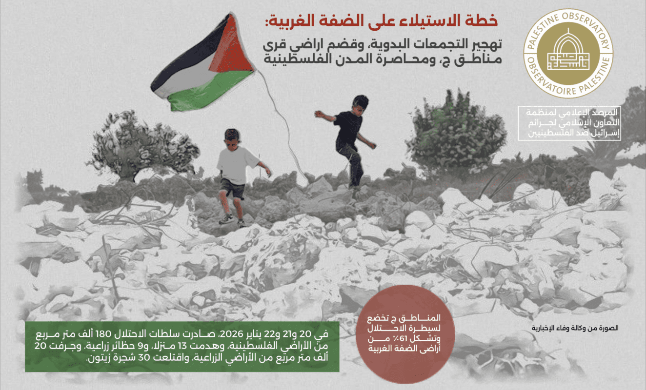 من أشكال الجرائم الإسرائيلية اليوم 20 يناير 2026، الاستيلاء على 180,000 متر مربع من أراضي بلدة الزاوية بسلفيت، وتخصيصها مقبرة للموتى من المستوطنين، في حين سارعت قوات الاحتلال إلى تسييج أرض أخرى بالأسلاك الشائكة ومنعت أصحابها الفلسطينيين من الوصول اليها بعد تصديهم لمحاولات رئيس بلدية الاحتلال في القدس، “أرئيه كينغ” ومستوطنين معه من الاستيلاء عليها بالقوة. مستوطنون إسرائيليون متطرفون يتجولون […]