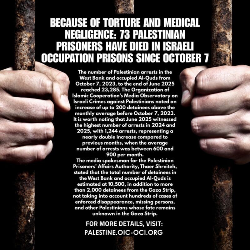 July 6, 2025 The number of Palestinian arrests in the West Bank and occupied Al-Quds from October 7, 2023 to the end of June 2025 reached 23,285. The Organization of Islamic Cooperation’s Media Observatory on Israeli Crimes against Palestinians noted an increase of up to 200 detainees above the monthly average prior to October 7, […]