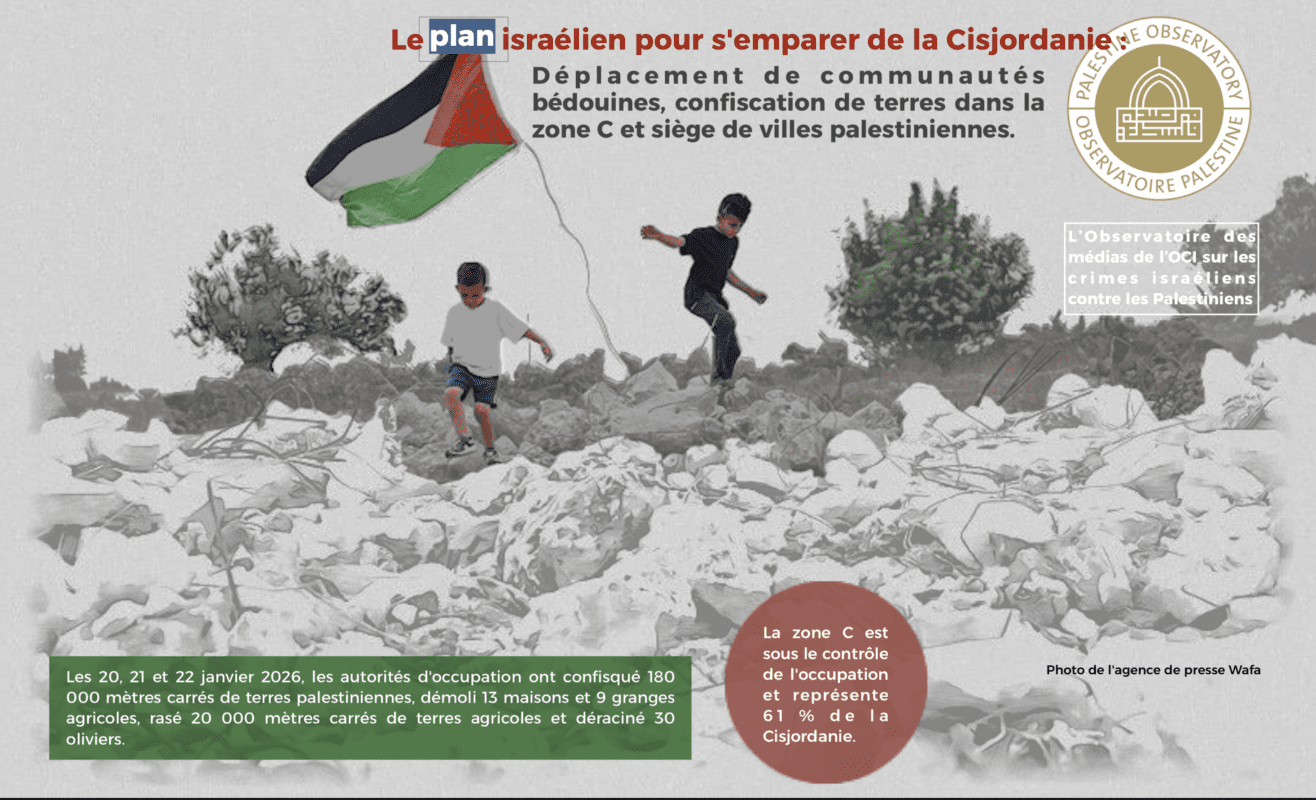 Parmi les formes de crimes israéliens commises aujourd’hui, le 20 janvier 2026, figure la saisie de 180 000 mètres carrés de terrain dans la ville d’Al-Zawiya, à Salfit, et leur affectation en cimetière pour les colons tués, tandis que les forces d’occupation se sont empressées de clôturer un autre terrain avec du fil barbelé et d’empêcher […]