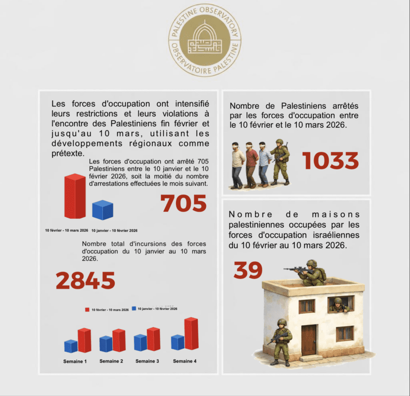 Bande de Gaza : 45 morts et blessés en une semaine, et les bombardements ciblent toutes les zones Ramallah, 10 mars 2026 Dans un contexte de tensions régionales persistantes, les forces d’occupation israéliennes ont intensifié leurs bombardements sur la bande de Gaza. Elles ont également multiplié les violations contre les mosquées Al-Aqsa et Ibrahimi à […]