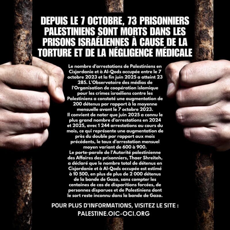 9 juillet 2025 Le nombre d’arrestations de Palestiniens en Cisjordanie et à Al-Qods/Jérusalem occupée entre le 7 octobre 2023 et la fin juin 2025 a atteint 23 285. L’Observatoire des médias de l’Organisation de coopération islamique pour les crimes israéliens contre les Palestiniens a constaté une augmentation de 200 détenus par rapport à la moyenne […]